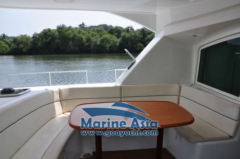 - The comfortable seating includes numerous storage compartments. Next to the flying bridge table, a bar cabinet can house an (optional) fridge or storage.