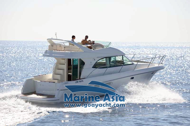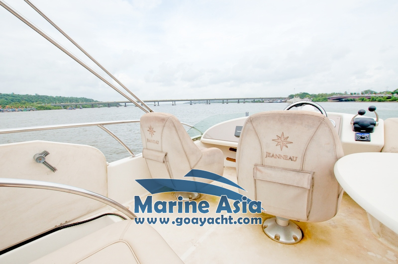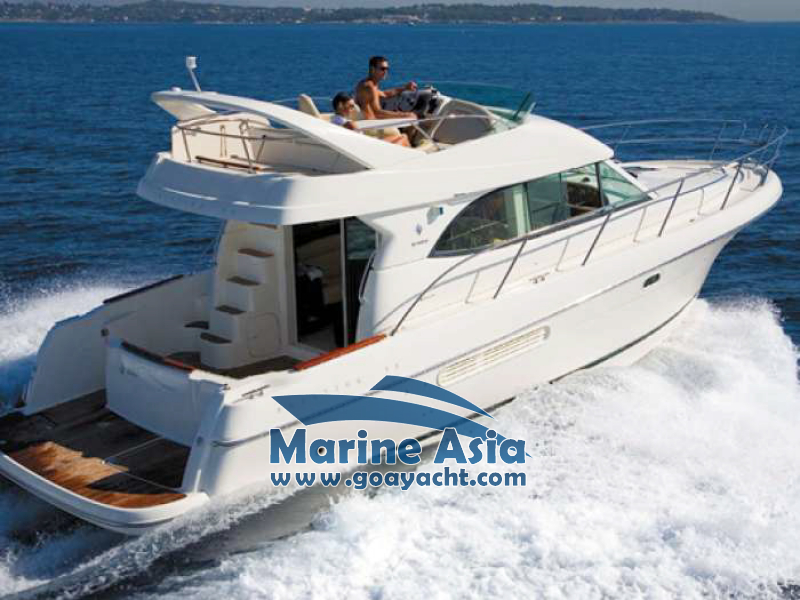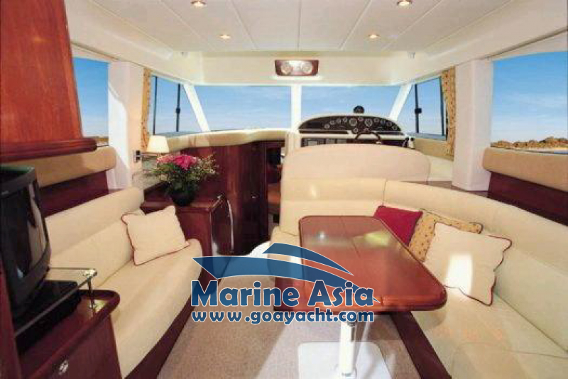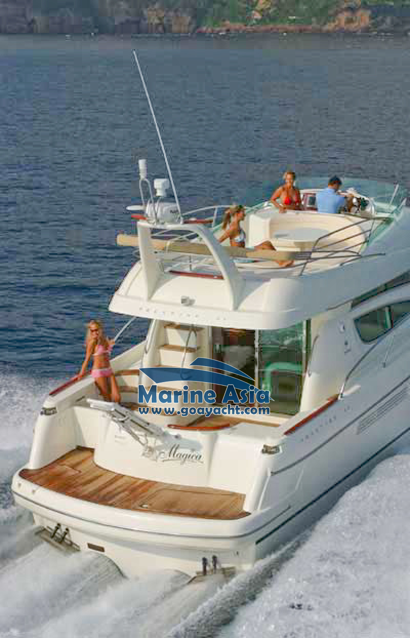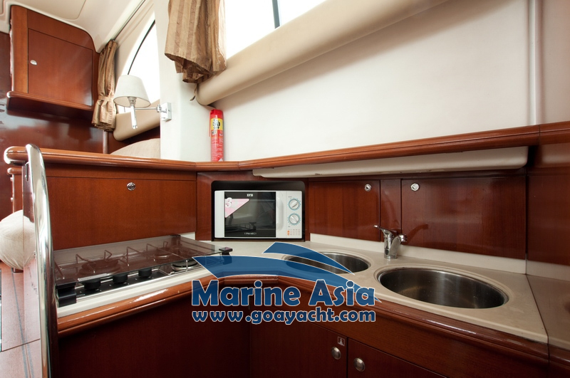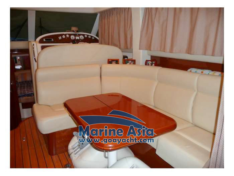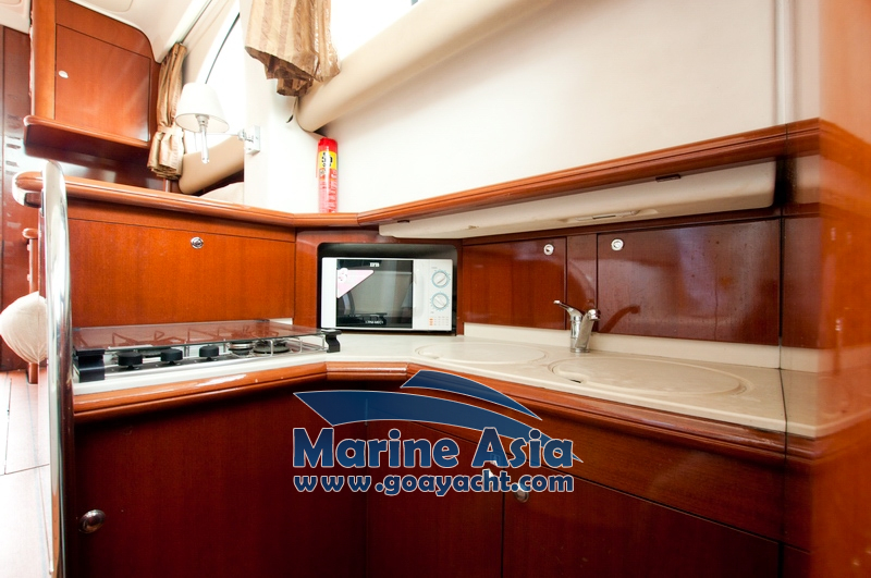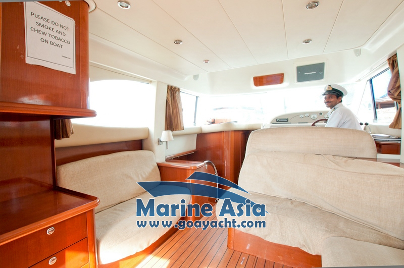 This beautiful yacht in Goa has two cabins, 2 washrooms with showers, a kitchen and a huge sunbathing area, an open-plan galley, a saloon, fly bridge, and large cockpit. This beautifully crafted Italian yacht is 42 feet in length.
